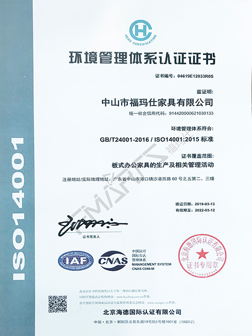 福瑪仕14001環境管理體系認證證書