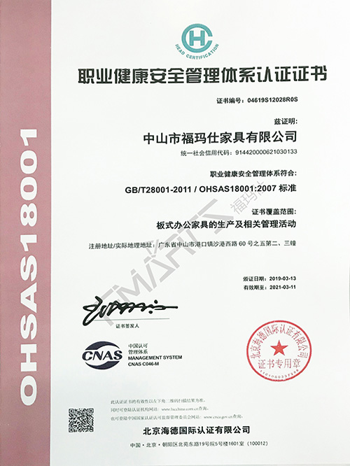 福瑪仕18001職業健康安全管理體系認證證書